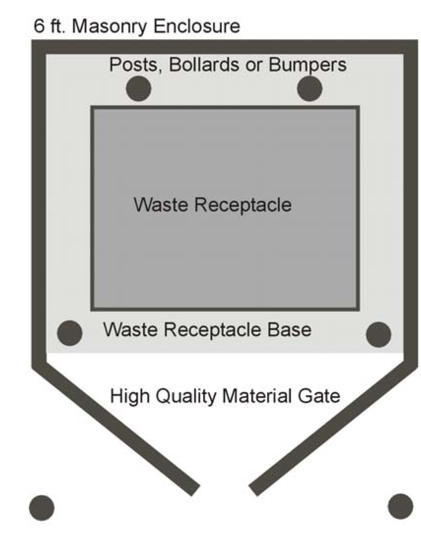 Waste receptacles shall be enclosed on three sides with a masonry enclosure with a maximum height of six feet or at least one foot higher than the dumpster.