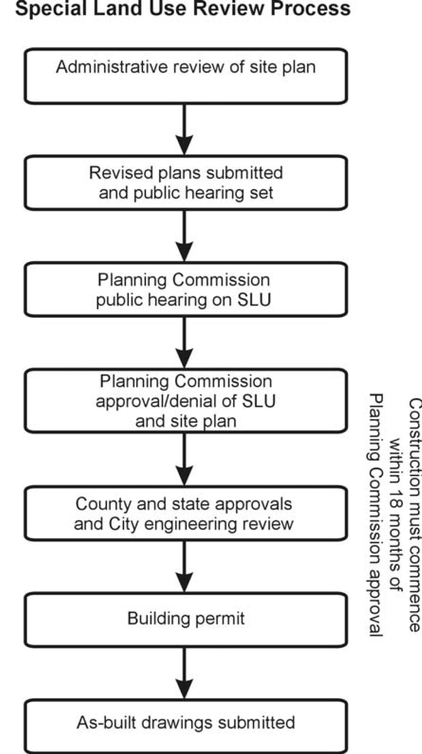 Special land uses are uses considered to be more intense, or potentially more disruptive, compared to the various uses permitted by right in a particular zoning district. The uses classified as special land uses vary by district and are listed in the regulations of each zoning district. The special land use procedures and standards are intended to: provide a procedure by which special land uses can be evaluated to determine their potential impacts; ensure impacts can be accommodated within the environmental, infrastructure, and public services capacities of the area; and, provide site design, and operational standards to minimize any negative impact on adjoining or nearby properties.