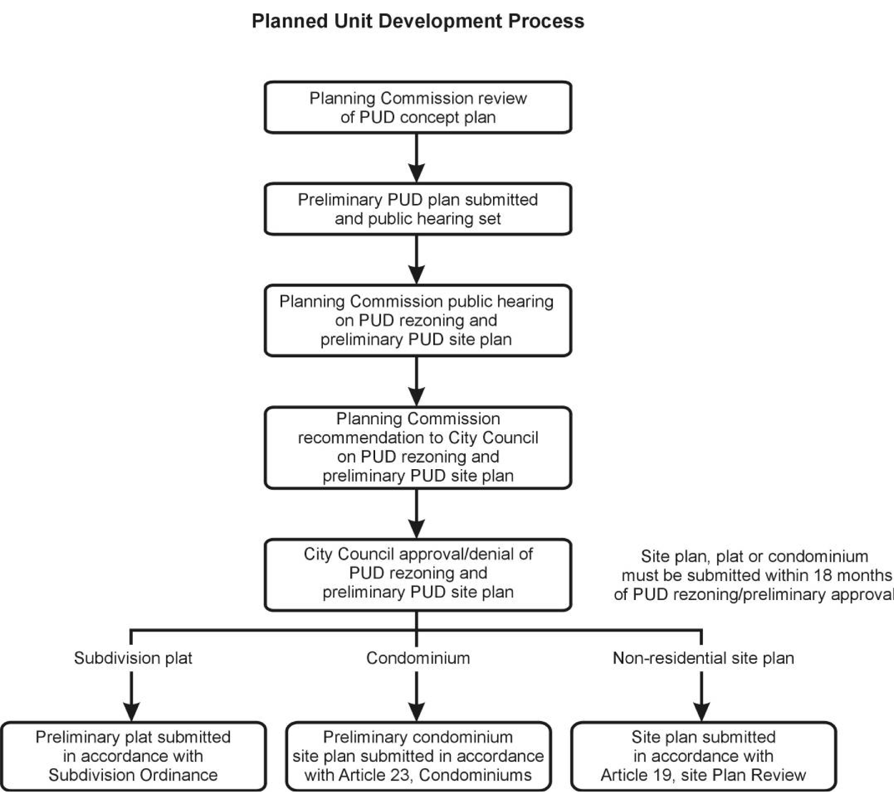 Plats and condominiums. For a PUD that is being developed as a subdivision plat or condominium, the preliminary plat or the preliminary condominium site plan shall be submitted and reviewed concurrently with the final PUD. In such case, the planning commission shall recommend approval of the preliminary plat or the preliminary condominium site plan to the city council in accordance with the city subdivision regulations or condominium regulations as applicable. The regular subdivision or condominium approval process shall be followed from this point forward.