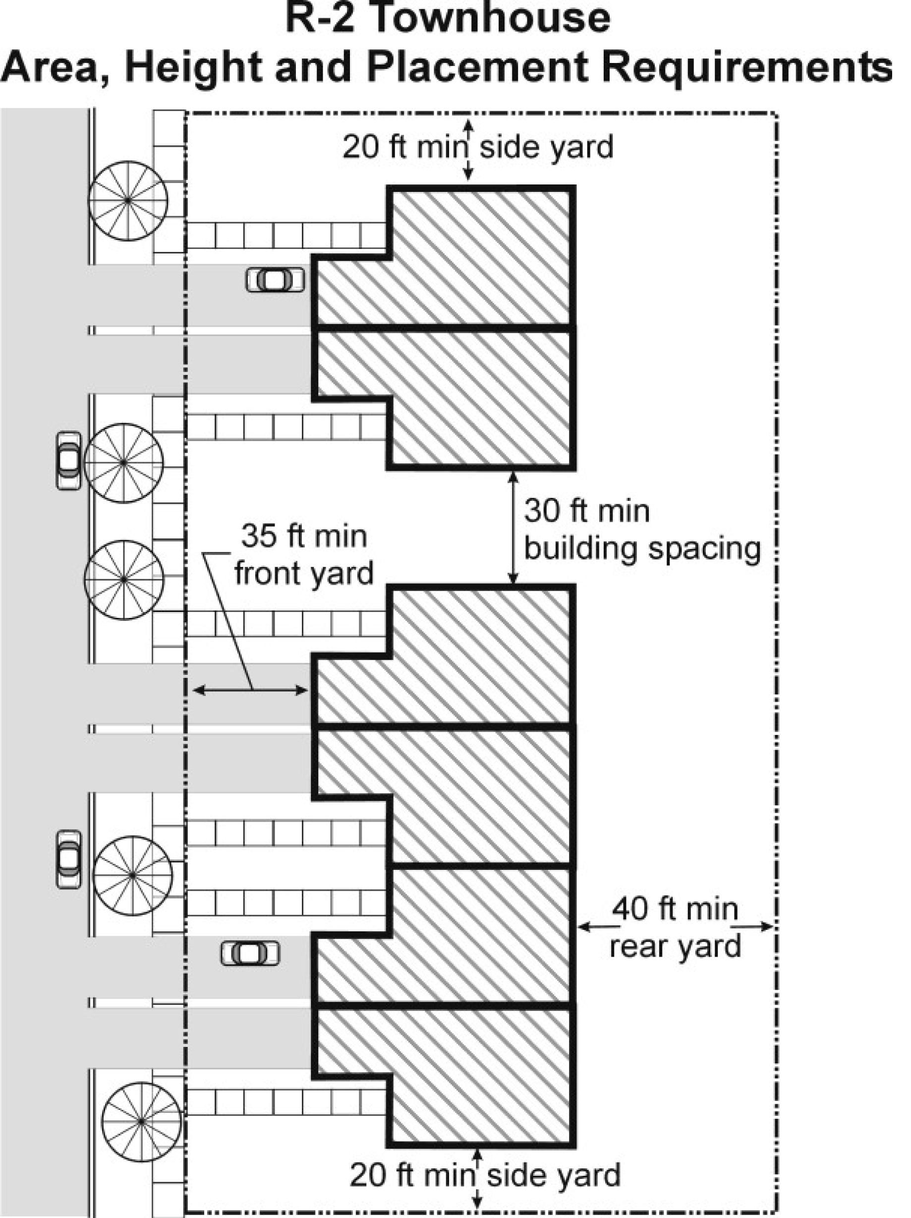 The R-2 Townhouse Residential District is designed as an intermediate density zoning district that allows a variety of housing types, including the single-family attached dwelling commonly termed the townhouse. It is intended that this district be used primarily on collector streets on smaller land parcels and in situations where the close proximity of single-family detached housing developments would be adversely influenced by the higher density traditional multiple family complex. It is intended to encourage development which, though multiple-family in nature, is closer in character or scale to single-family development, with duplexes and attached townhouses, each having individual entrances, yards, driveways and garages.
