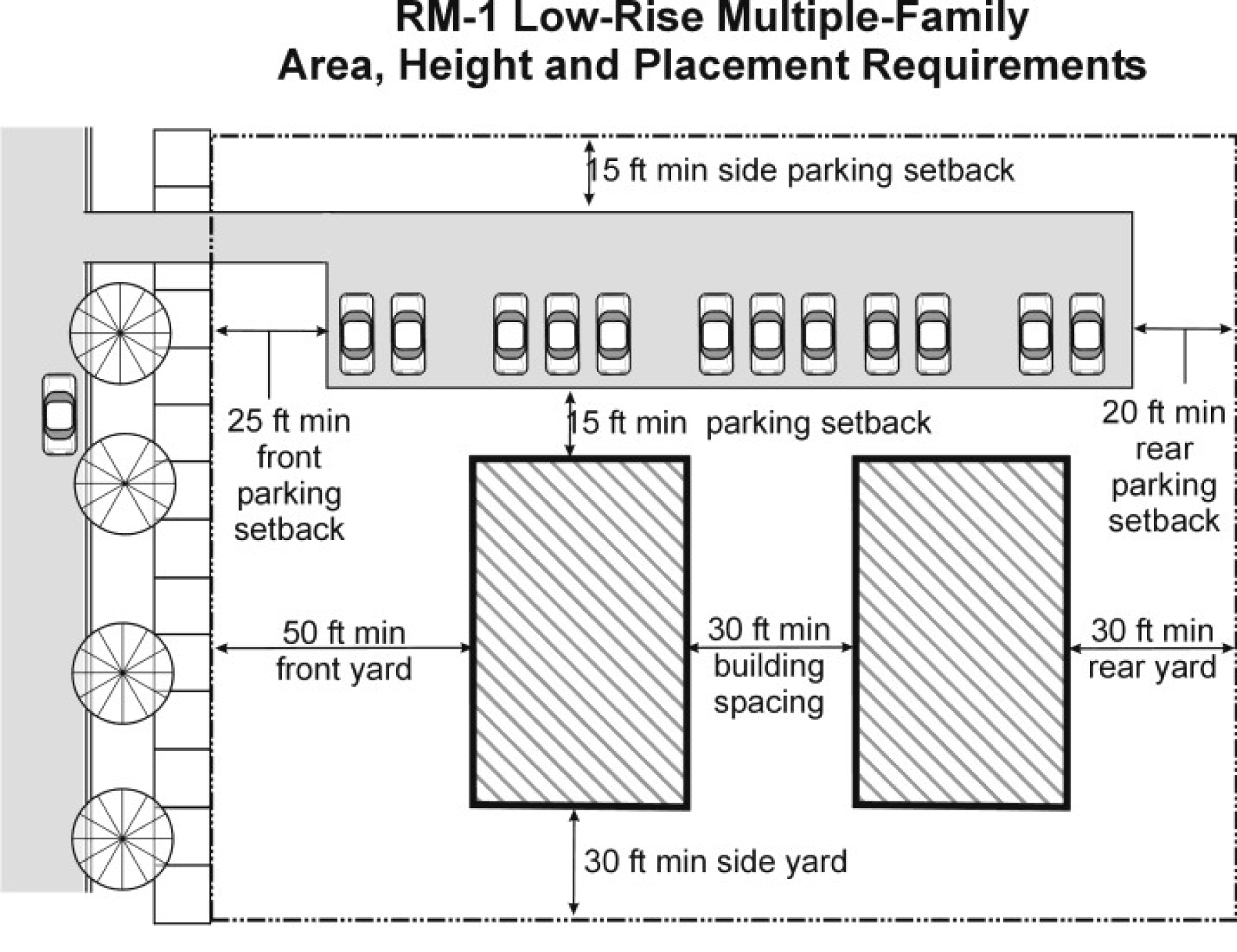 The RM-1 Low Rise Multiple-Family Residential District is intended to provide sites for multiple-family dwellings of low-rise construction and residentially-related uses that serve the residents in the district. This district is intended to provide a proper environment for families that are smaller in size than those living in single-family dwellings, who wish to live in low-rise multiple-family dwellings. The RM-1 district is designed to furnish sites for various types of attached single-family and multiple-family dwelling structures and may serve as a transition between nonresidential districts and lower density single-family residential districts.