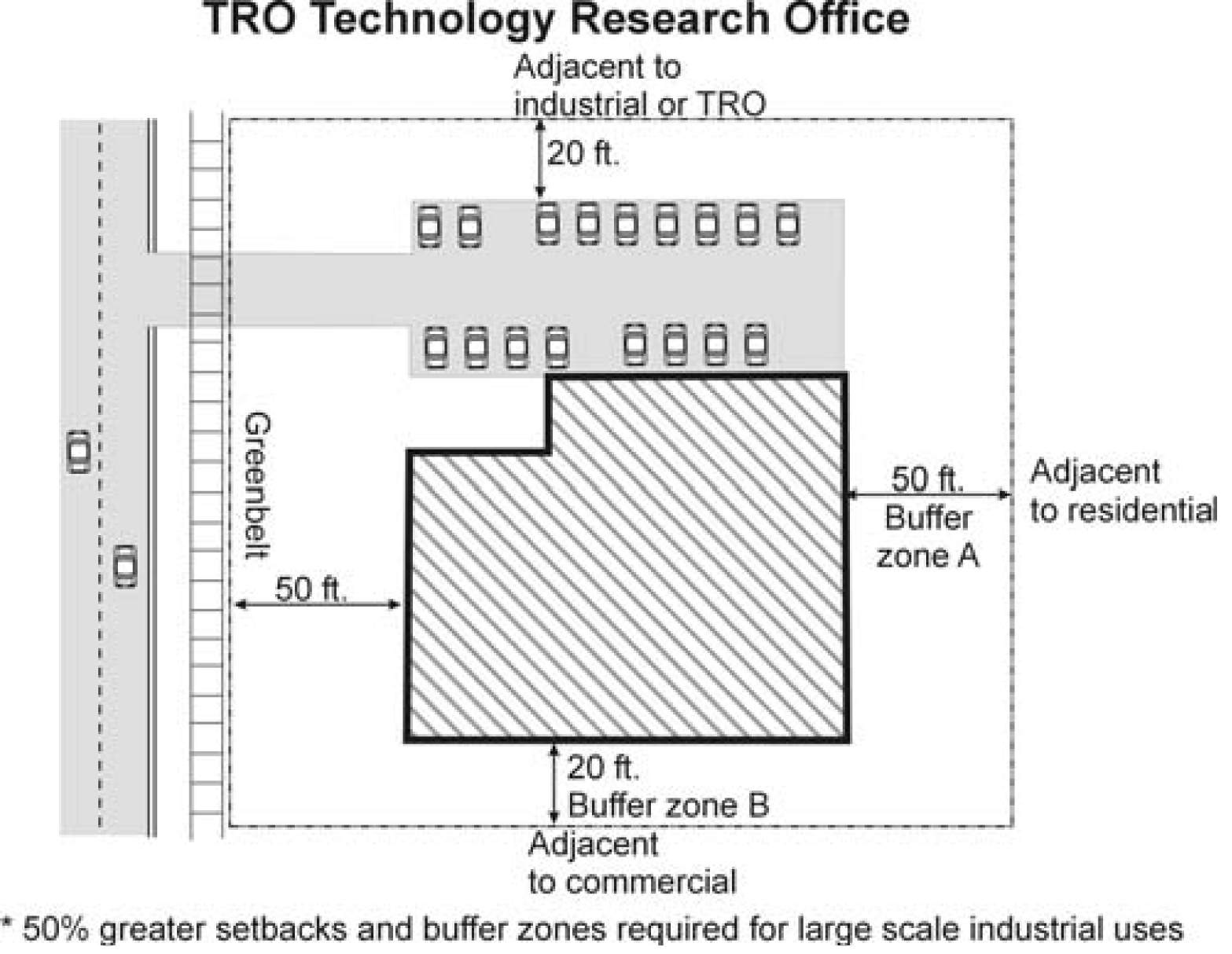 The purpose of the TRO Technology-Research-Office District, is to provide an environment where high tech uses and functions such as engineering, design, research and development, computer assisted design, robotics research, prototype development and limited manufacturing, telecommunications, and related storage, warehousing and limited assembly operations associated with principal permitted uses can be located. Advances in industry, technology, and office research facilities, have created uses which are related to industry and office uses, but may not be appropriate or function adequately in a typical industrial or office zoning district. These uses have been identified as high tech uses. The TRO district will be located in a campus-type environment and so situated that uses will be developed without being negatively impacted by elements and conditions which are commonly found in an industrial zoning district.