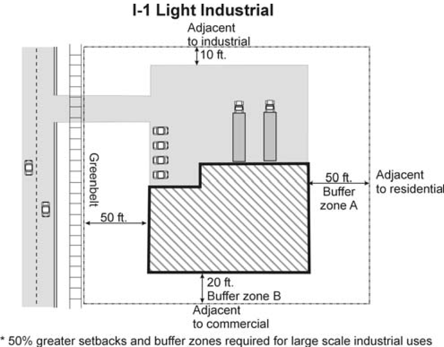 The I-1 Light Industrial District is designed so as to primarily accommodate wholesale activities, warehouses, and industrial operations whose external, physical effects are restricted to the area of the district and in no manner affect in a detrimental way any of the surrounding districts. The I-1 district is so structured as to permit, along with any specified uses, the manufacturing, compounding, processing, packaging, assembly, and/or treatment of finished or semi-finished products from previously prepared materials. It is further intended that the processing of raw material for shipment in bulk form, to be used in an industrial operation at another location, not be permitted. Uses in this district must have less of an impact on surrounding uses and generate less truck traffic than the other industrial developments. Limitations regarding the degree of noise, smoke, glare, odor, and vibration are placed upon such uses to preclude any adverse effects upon nearby commercial or residential districts. It is intended that this district act as a transition between heavier industrial uses and residential or commercial areas. The general goals of this use district include, among others, the following specific purposes: