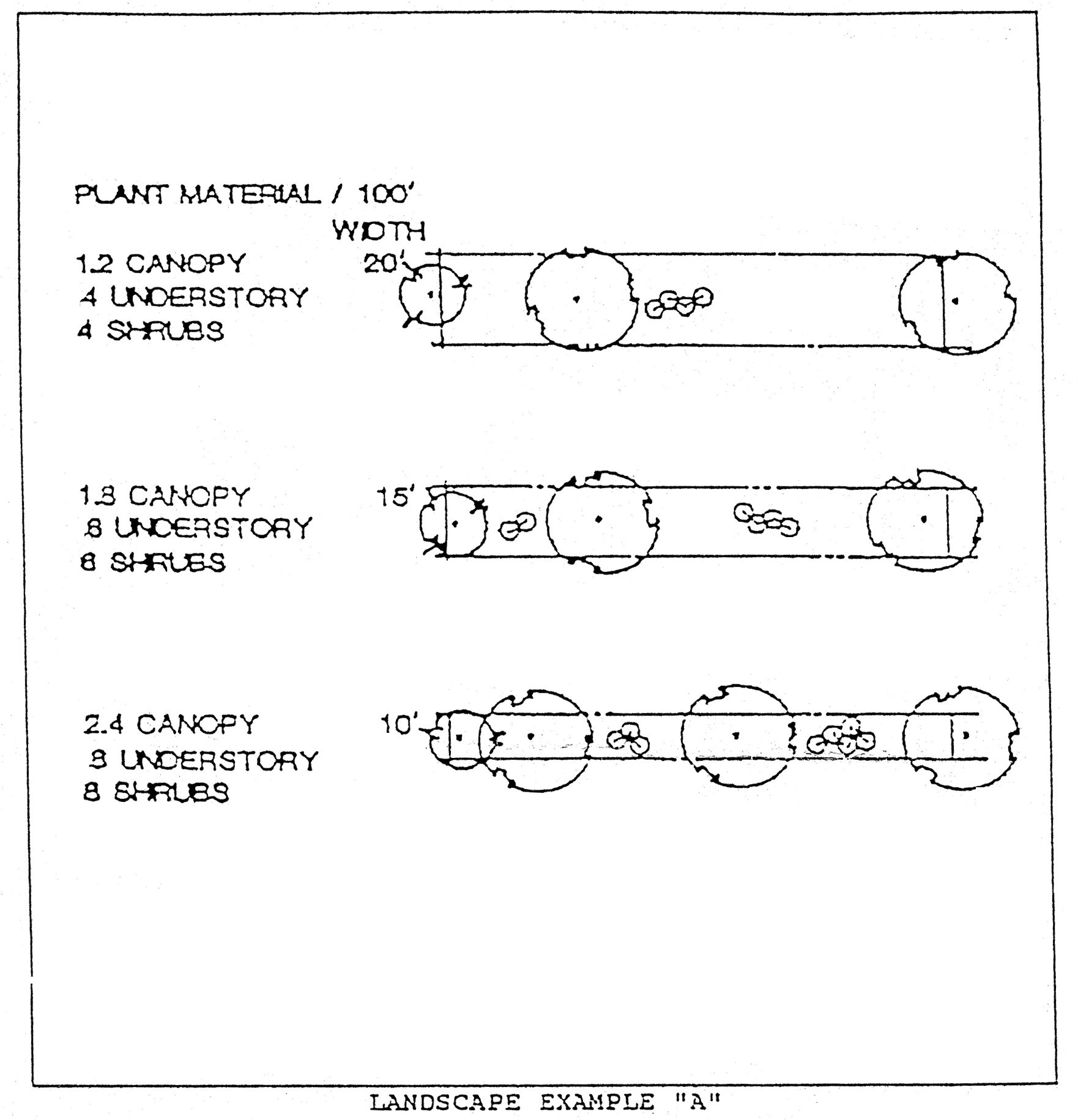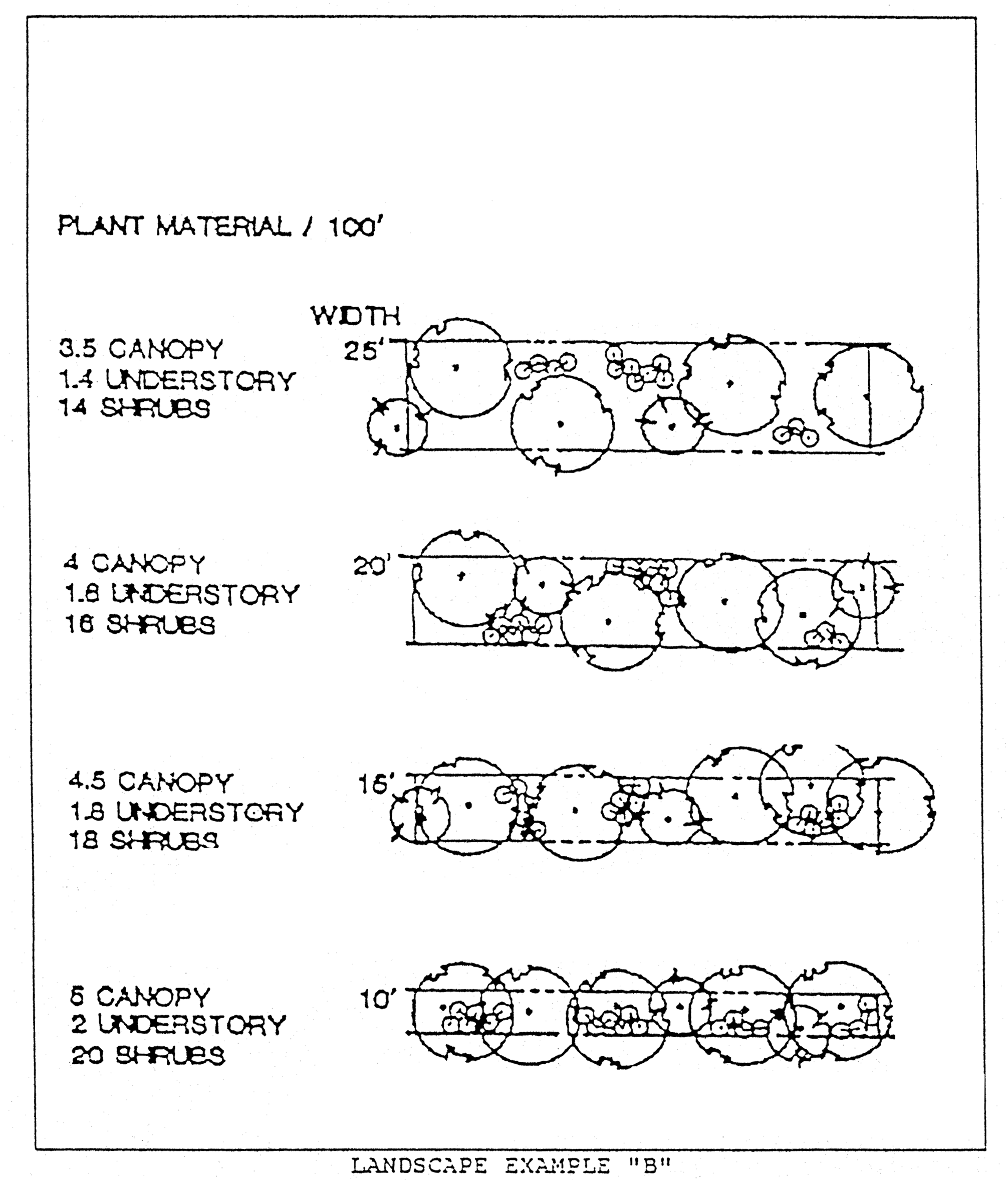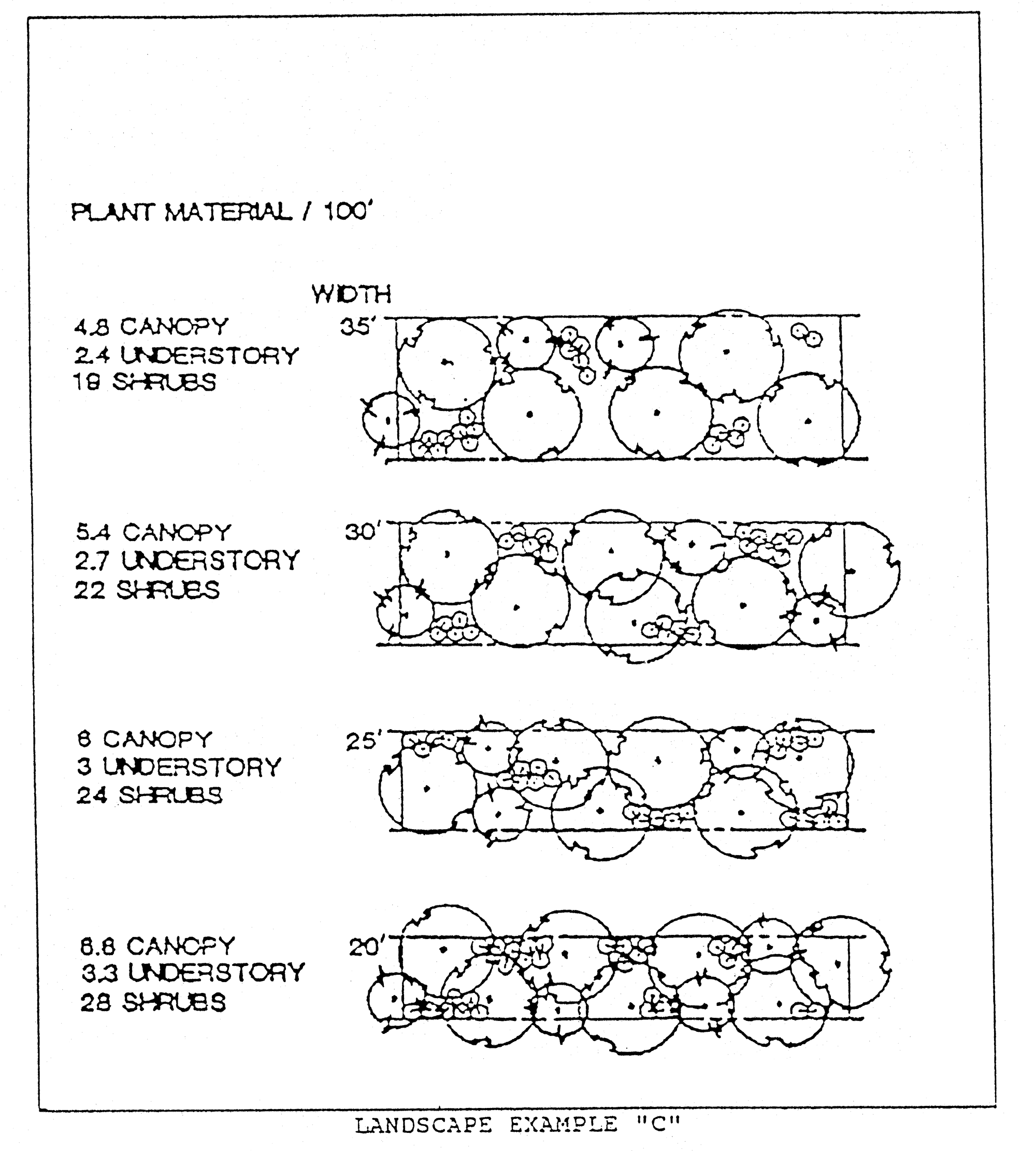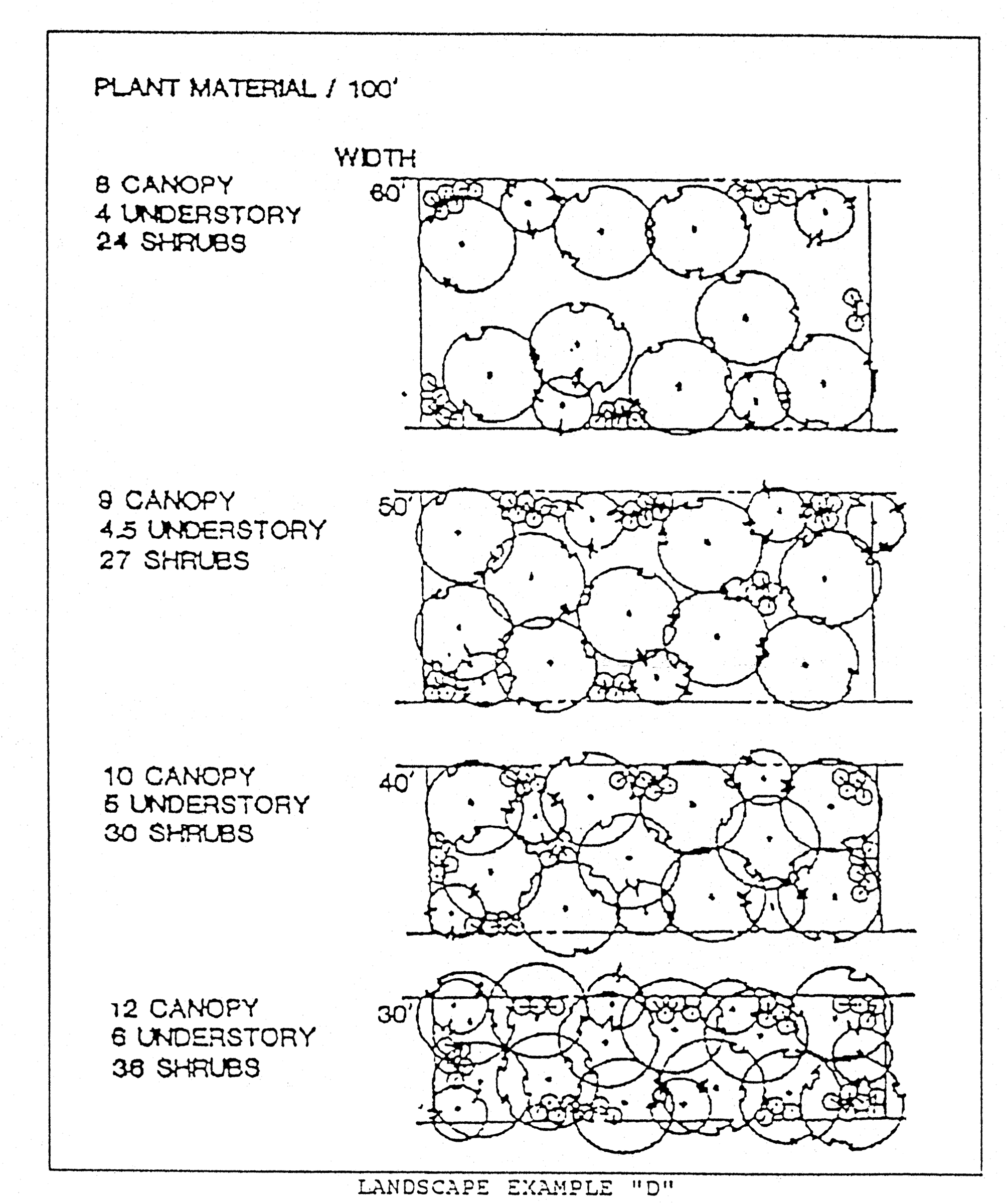 Landscaped buffers are also required to conserve the values of land and buildings and to provide adequate light and air. The width of the buffer and the required plantings within the buffer vary depending upon the relative intensities of the abutting or adjacent uses. The buffer requirements are intended to be flexible; the developer may choose among a number of combinations of buffer width and buffer plantings to satisfy this requirement.