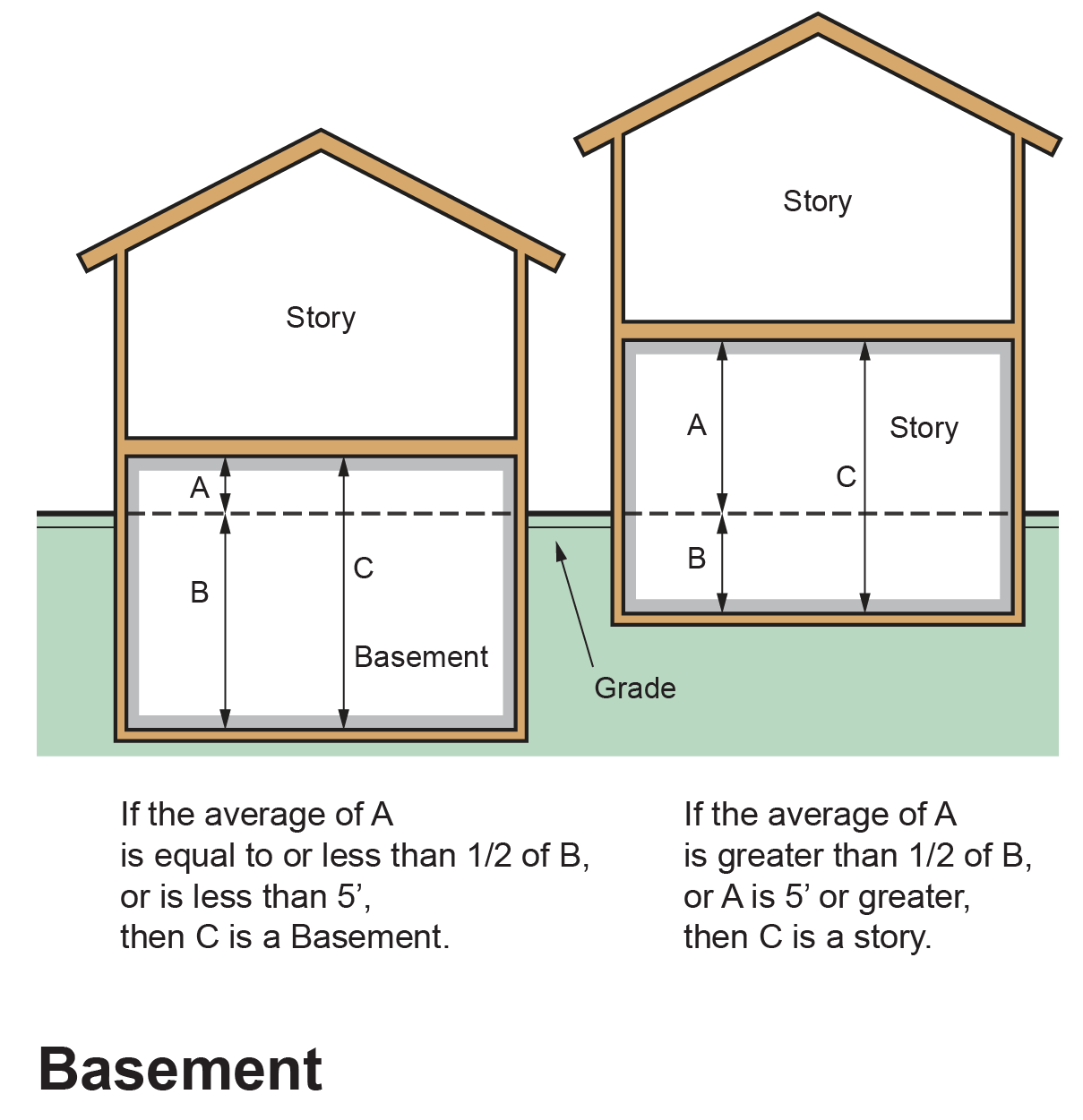 Basement. The portion of a building located partly below grade but located so as the vertical distance from the average grade to the basement floor is greater than the vertical height from the average grade to the basement ceiling; provided, however, that if the vertical distance from the average grade to the basement ceiling is five (5) feet or more, such basement shall be considered as a story.