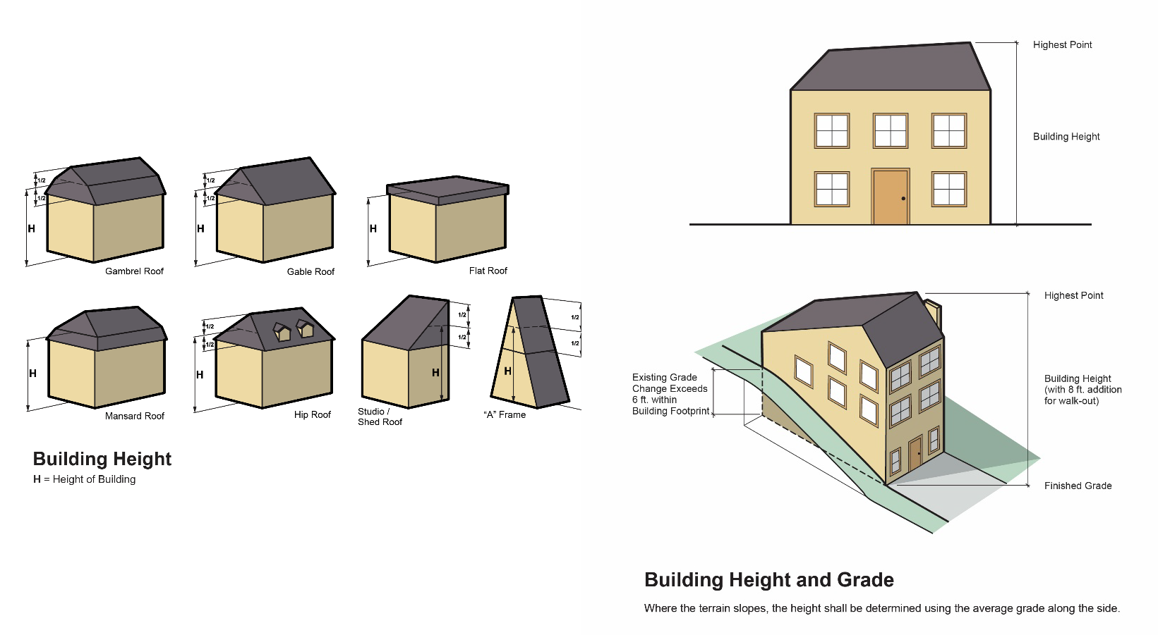 Building height. The vertical distance from the established sidewalk grade at the center of the front of the building to the highest point of the roof surface of a flat roof, to the deck line for mansard roof, and the mean height between the eaves and the ridge for gable, hip and gambrel roofs. Penthouses, towers, cupolas, steeples, antennas and other roof structures used only for mechanical operation of the building shall not be included as the height of the building. Where a building is located on sloping terrain, the height may be measured from the average ground level of the grade at the building wall.