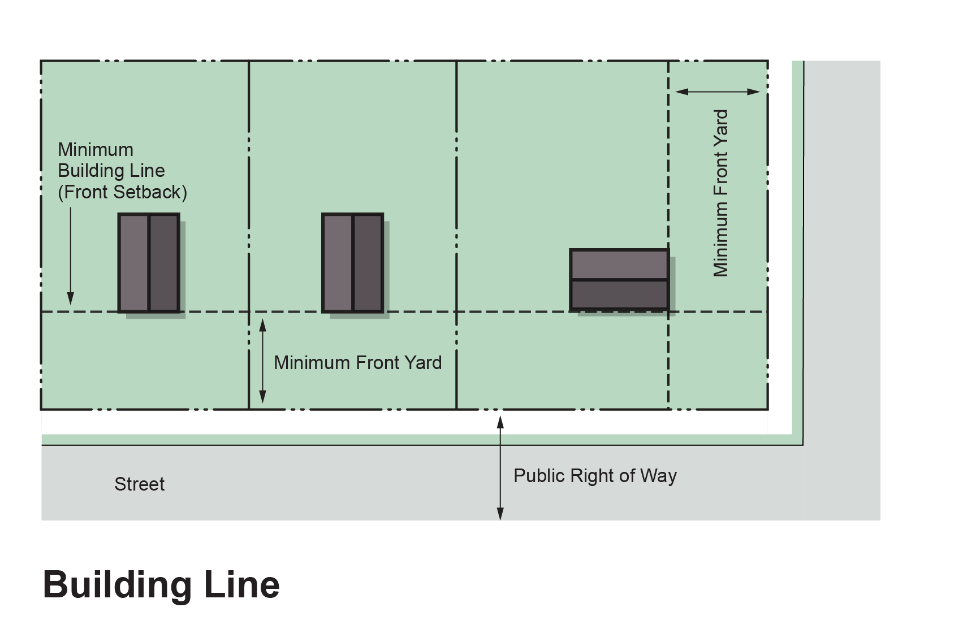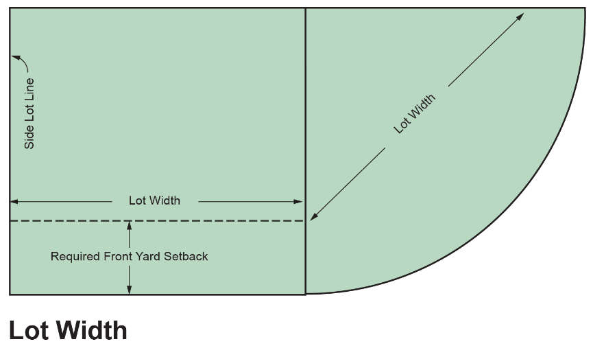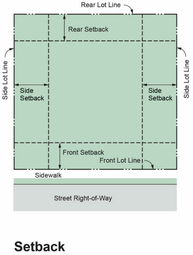 Setback Line. The distance required to obtain the minimum required distance between the front, side or rear lot lines and the building line or parking lot. Setbacks from a public street or private road shall be measured from the right-of-way line or easement. Front setbacks along curvilinear streets shall be established along a line connecting points along the side lot lines meeting the required front yard setbacks. Driveways and pedestrian walkways may be located within the setback, but the remainder of the area shall be deemed open space. Setbacks for buildings shall be measured from the foundation wall.
