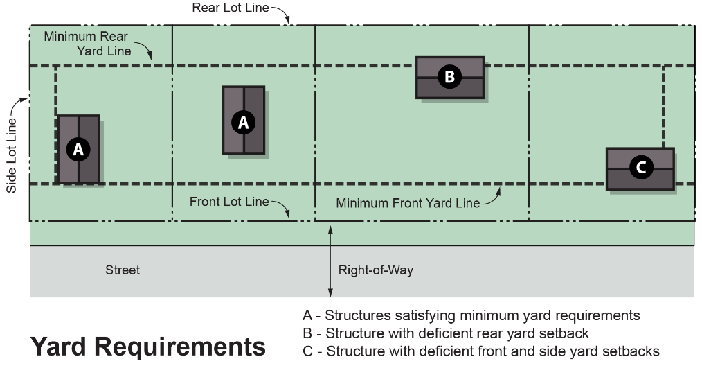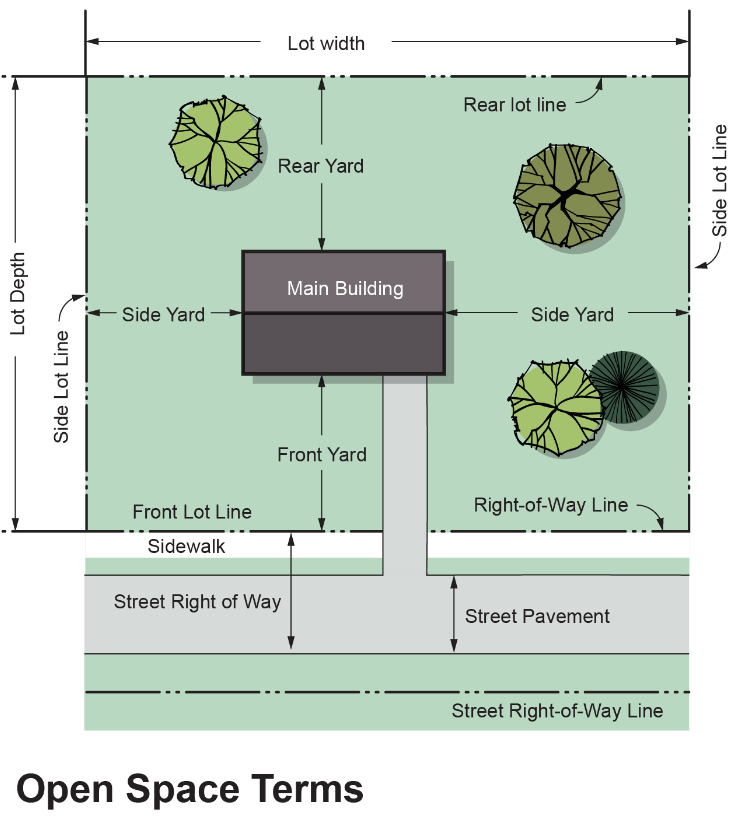 Yard, required. The open space between a lot line and the yard line within which no structure shall be located except as provided in the Zoning Ordinance.
