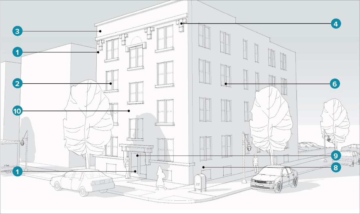 Middle. The middle may include buildings and/or balconies that are located between the reveal and the cap area.