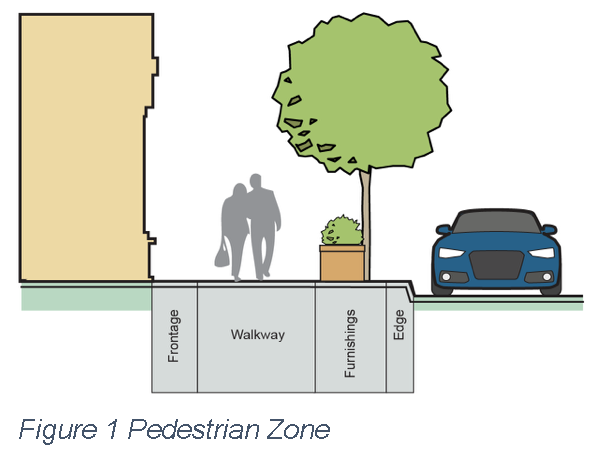 Pedestrian zone. The pedestrian zone is considered to be the area in between the curb and the edge of the right-of-way, and includes area for sidewalks, landscape plantings, street furniture, and other pedestrian-scale uses and amenities. The treatment of the pedestrian zone determines the character of the street, and the quality of the public realm within the right-of-way. Streets are the most common public space in the City and must be designed to be welcoming and accommodating for pedestrians as well as motorized traffic. The pedestrian zone in the Downtown districts should contain four (4) distinct areas, an edge area that allows car doors to open freely and accommodates parking meters, streetlights; a furnishings area that accommodates amenities such as landscaping, planters, and sidewalk furniture; a walkway area where pedestrians walk; and a frontage area adjacent to the building. Figure 1 illustrates the four (4) areas of the pedestrian zone.