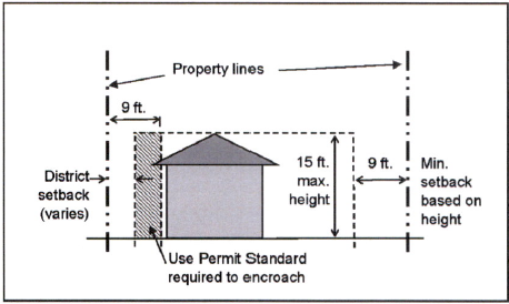 Accessory buildings shall be setback at least three (3) feet from all side and rear property lines. An additional one (1) foot setback is required for every additional foot in height above nine (9) feet, up to fifteen (15) feet in height. This requirement may be reduced to the minimum setback standards required in the district, subject to approval of a Use Permit Standard, pursuant to Section 6-308;