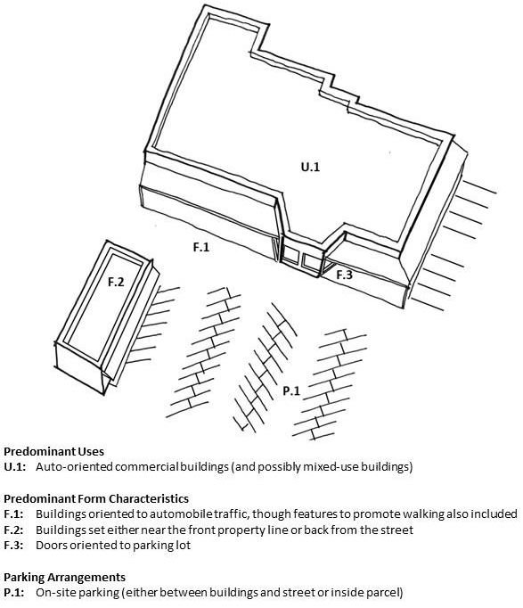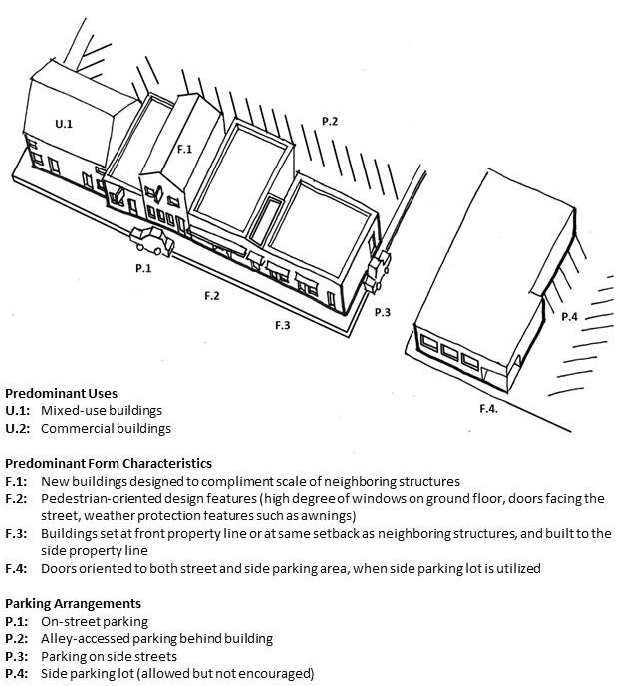Form. The western portion of the transitional commercial area should be a continuation of the retail and cultural center functions of the West Center area. Form should generally follow the characteristics listed for the West Center area. The eastern portion of the transitional commercial area (beyond where the hill creates a narrow strip of land between the hillside and roadway) may have buildings that are spread farther apart with parking located between the structures.