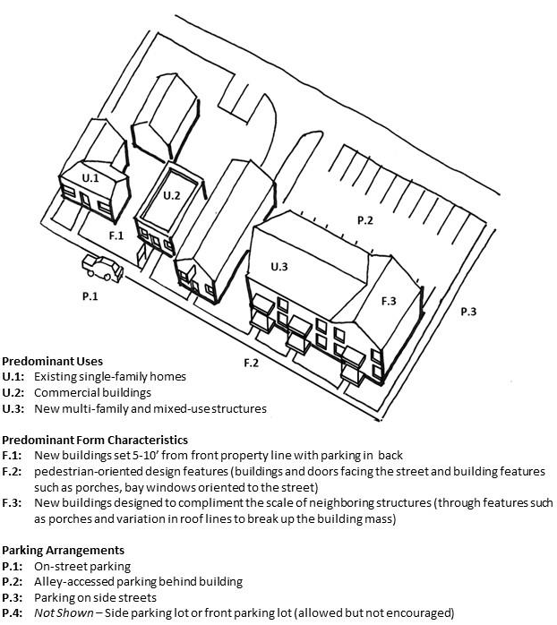 Form. A mix of housing types is appropriate. Mixed-use development may also be appropriate but may not in total exceed the ten percent of the area. Mixed use buildings should have some sandstone features and be pedestrian oriented with parking at the rear of buildings.