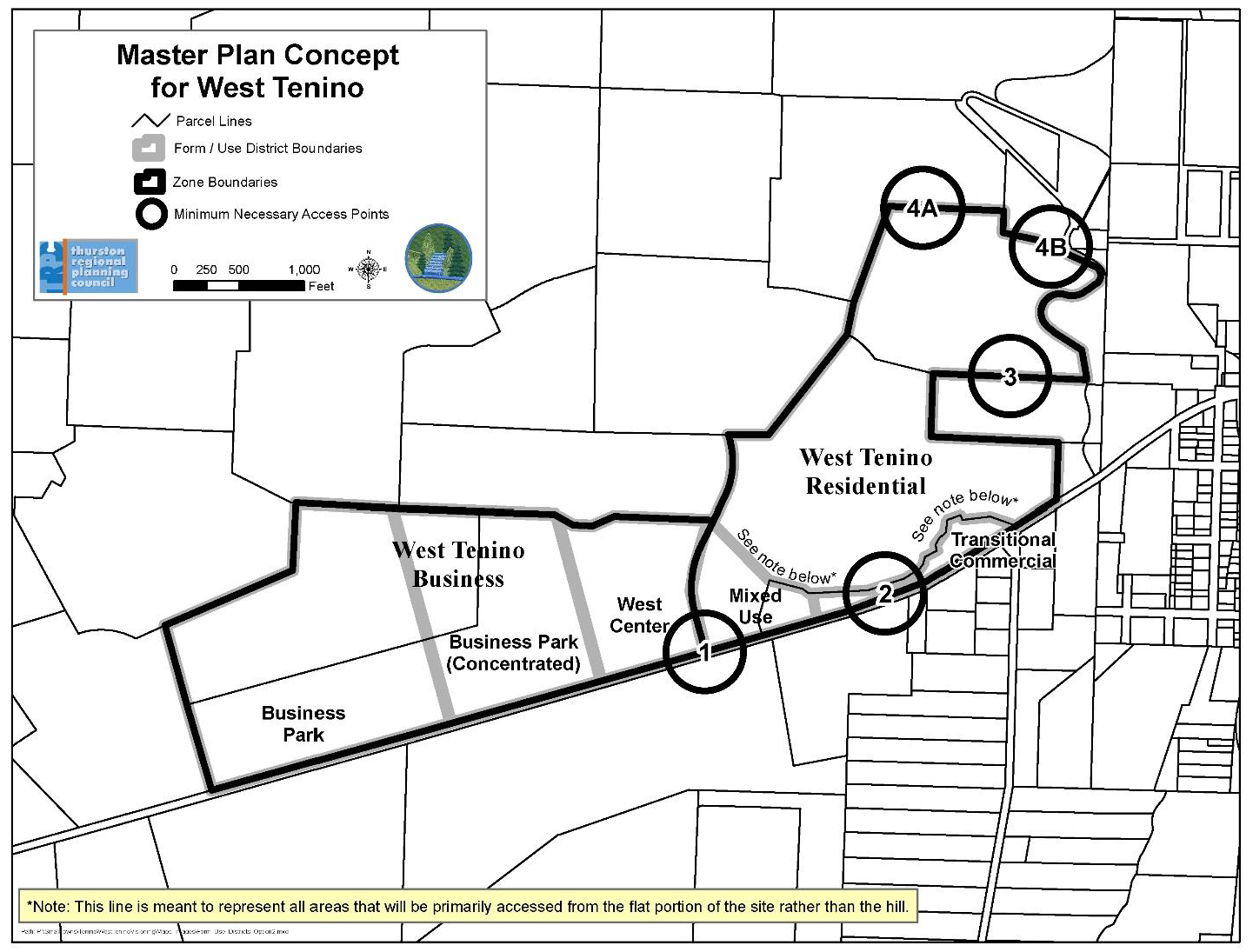 Reserve areas allowed. Reserve areas for future master plans may be established in the West Tenino Residential area (shown below) as part of a master plan. Reserve areas must be at least 20 acres in size, and have a shape appropriate for the development of a future master plan. When a reserve area is utilized, the transportation element and utilities element of the original master plan must show how roadways and utilities will be provided to the reserve area.