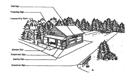 SUSPENDED SIGN: Signs which are hung under the eaves of a building, parallel to the building wall.
