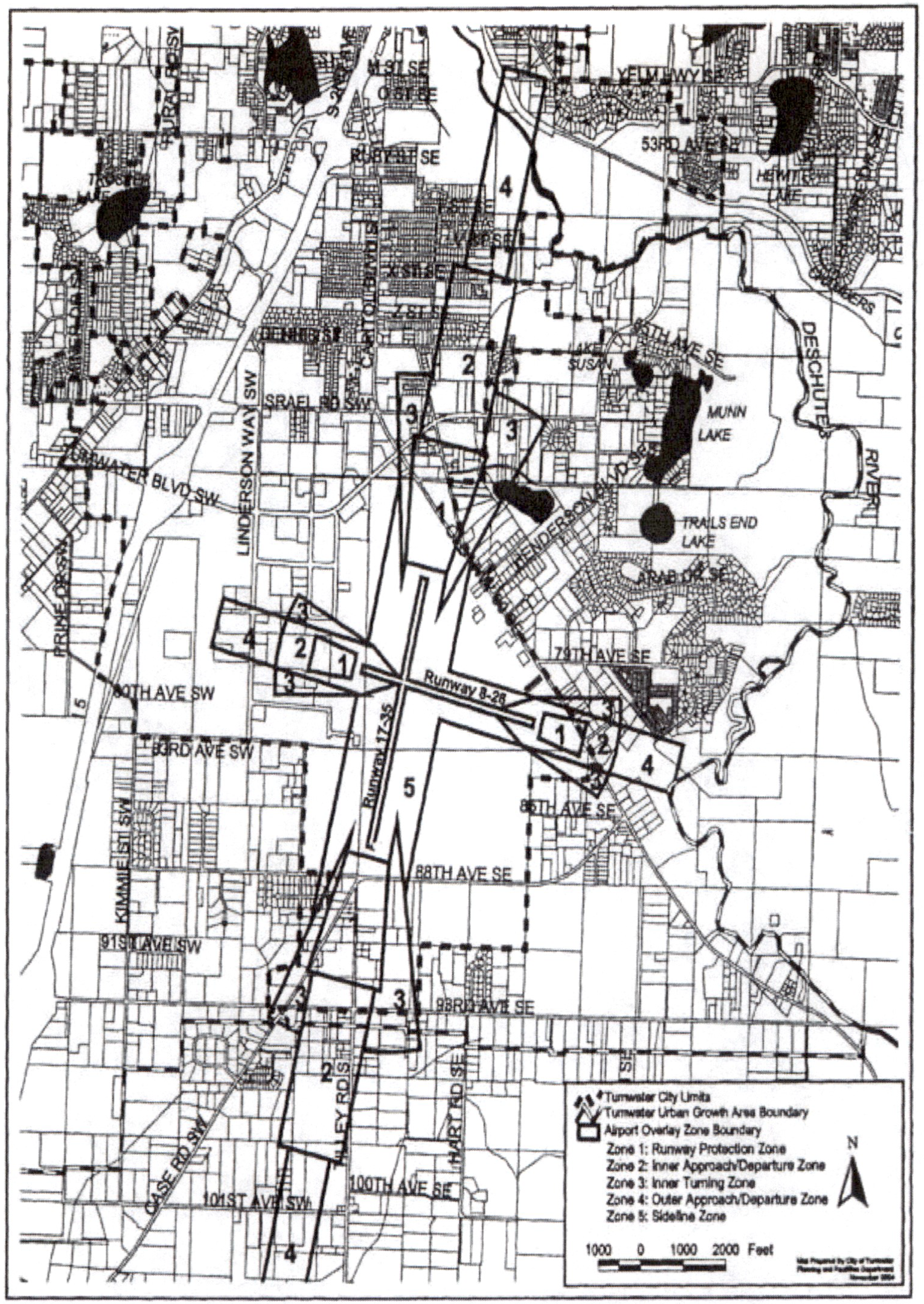 An airport (AP) overlay zone district is applied that is comprised of five compatible use zones. The compatible use zones are established to carry out the provisions of this chapter and to promote land use compatibility on lands within, adjacent to and in the vicinity of Olympia Regional Airport. The five compatible use zones delineated in Figure 20.30D.050 consist of the following: