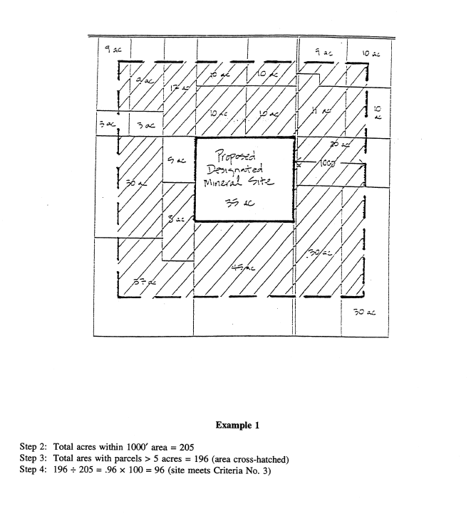Step 4: Divide the acreage from Step 3 by the total acreage from Step 2, and multiply this number by one hundred. If the final result is sixty or greater, Criteria No. 3 has been met and, if all other criteria are met, the proposed mineral site may be approved for designation status. If the final result is less than sixty, the proposed mineral site does not meet Criteria No. 3 and, therefore, does not qualify for designation status.