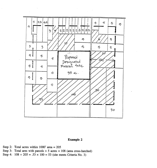 While the zoning may allow additional five-acre parcels to be created after a mineral site is designated, from that point on new property owners are notified that there is a long-term mineral operation nearby and that there may be temporary periods when the mining activities may not be compatible with residential development. Therefore, Criteria No. 3 focuses solely on surrounding parcel sizes existing at the time of application for designation.