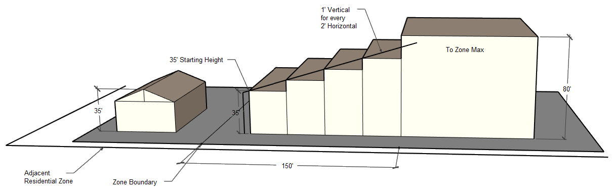 For buildings within one-hundred fifty feet of any residentially developed or zoned property, building heights shall start at thirty-five feet at the property line. Additional building height may be added at a ratio of 1 to 2 (one foot of additional building height for every two feet of additional horizontal distance from the closest property line shared with a residential zone or development). The building height transition requirement ends one hundred fifty feet from the residential zone/development. Beyond the transition the maximum building height allowed in zone applies. This applies to all uses except for structures exempted from this height requirement pursuant to Section 20.07.080;
