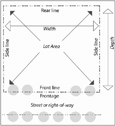 "Width". The distance between the side property lines of a site measured in the mean direction of the front and rear property lines at the front setback line of the site.