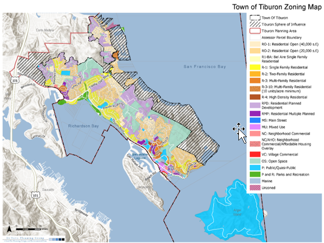 "Zoning map". The map entitled, "Town of Tiburon Zoning Map" (see section 16-14.020 [zoning map]).