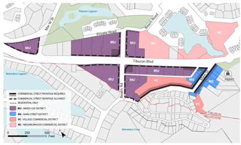 Required commercial street frontages. The Town of Tiburon Zoning Map indicates where commercial street frontages are required, and where they are allowed but not required.