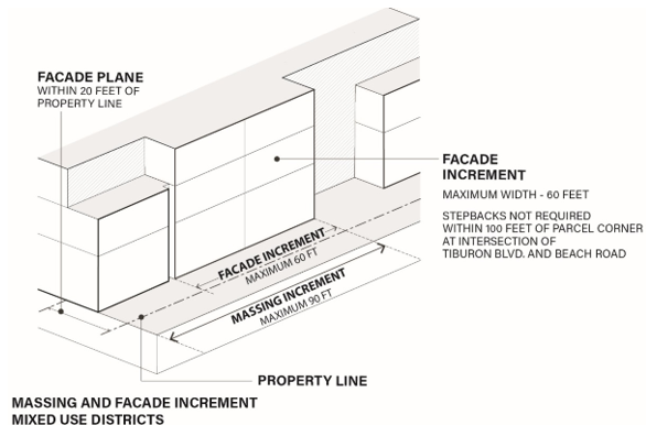 (7) Stepback requirements do not apply to building facades that: face the corner of Tiburon Boulevard & Beach Road in conformance with subsection 16-30.050.E (height limit at street intersections), or to one facade increment within each massing unit, in conformance with subsection 16-23.060.A (scale of development).
