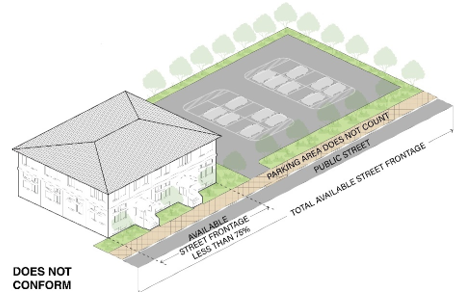 Street frontage continuity. At least 75 percent of a parcel's total available street frontage adjacent to a public right-of-way shall be occupied by commercial street frontage, residential street frontage, community open space, or some combination of these, as defined in section 16-23.050.B (commercial street frontage) and section 16-23.050.C (residential street frontage), and as illustrated in Figure 2-3 (street frontage continuity). Areas devoted to parking and service areas may not be used to meet this requirement.