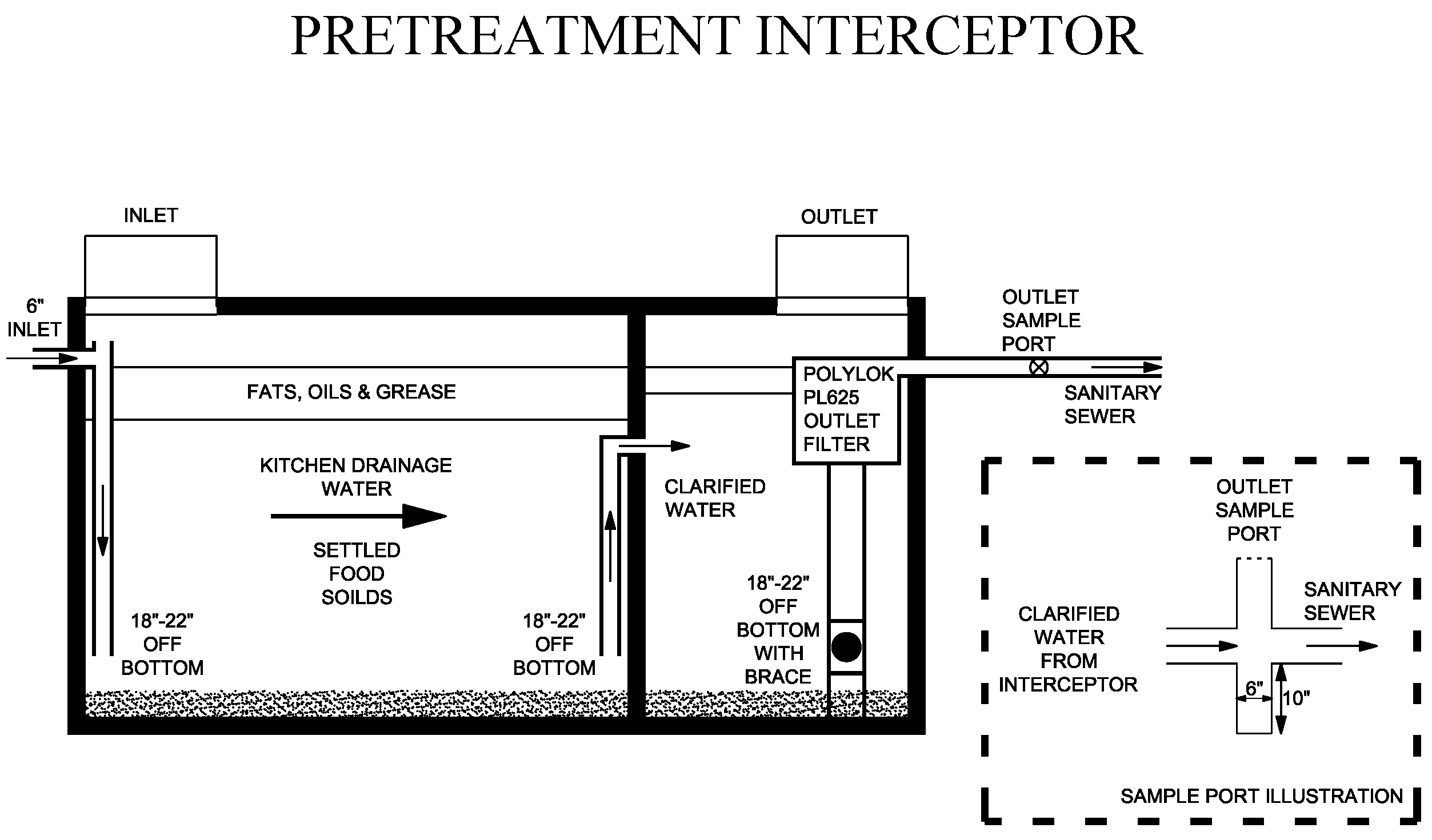 Inlet and Outlet Piping - Wastewater discharge to the grease interceptor shall enter only through the inlet pipe of the interceptor. The inlet pipe shall extend below liquid level and discharge 18 to 22 inches from bottom of interceptor. The outlet pipe consist of a polylok PL625 outlet filter with pipe bracing extended to the interceptor floor and a tee branch installed 18 to 22 inches from bottom of interceptor. Each grease interceptor shall have only one inlet and one outlet pipe.