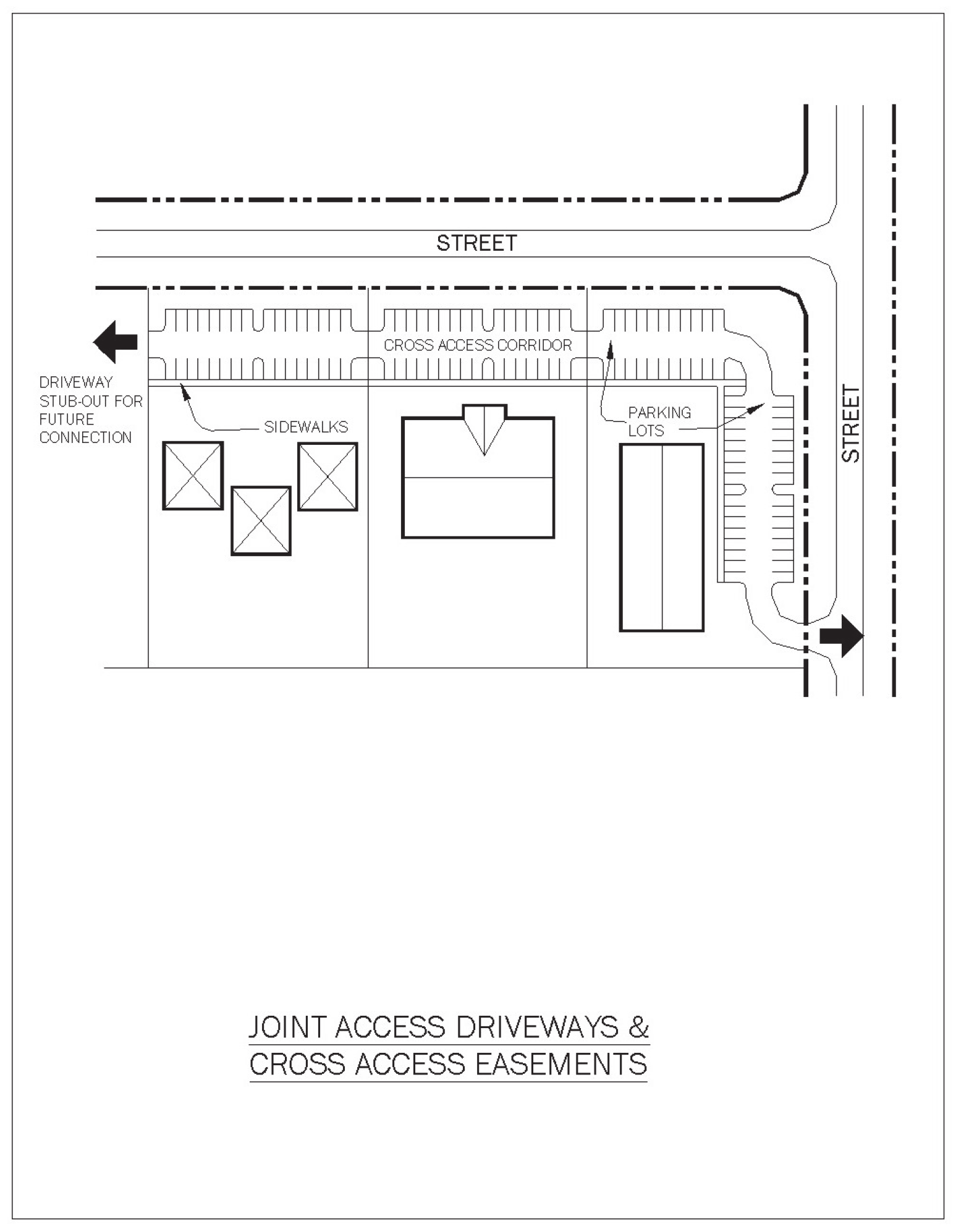 Stub-outs and other design features to make it visually obvious that the abutting properties may be tied in to provide cross-access via a service drive; and