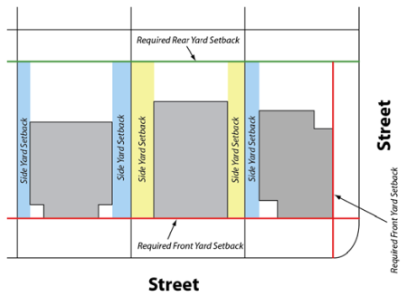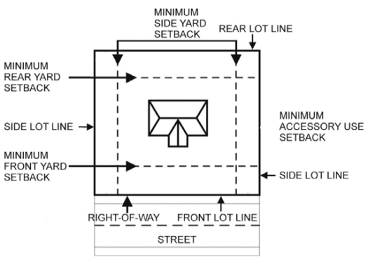 Figure 154.04-B: Measurement of typical front, side, and rear yard setbacks.