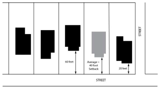 Figure 154.04-C: Illustration of the averaging of front yard setbacks. In a district