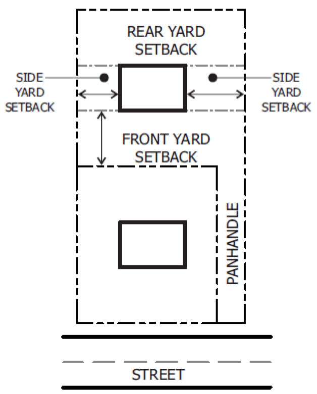 Figure 154.04-H: Yard and front yard setback locations on a panhandle lot.