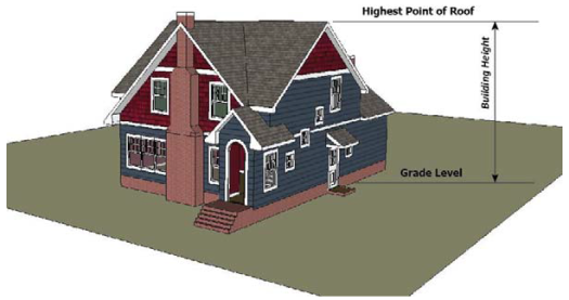 Where specified in feet, the building height shall be measured from grade to the highest point on the roof, regardless of roof type.