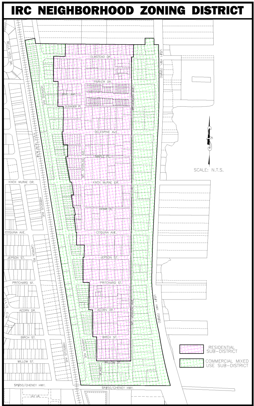 Sub-districts established. The Indian River City Neighborhood Zoning District has two (2) sub-districts, each with separate uses and regulations. The Commercial Mixed-Use Sub-District is generally located on properties with direct access to Washington Avenue and Hopkins Avenue. The Residential Sub-District is generally located within the interior of the neighborhood and is described in the Indian River City Neighborhood Plan as the "Core Residential Area." It is the clear intention of the City that the boundaries established for the single-family "Core Residential Area" are firm and shall not be changed unless the City has gone through the appropriate process of changing the IRC Neighborhood Plan to justify the changes. The Sub-District boundaries are provided in the Map below: