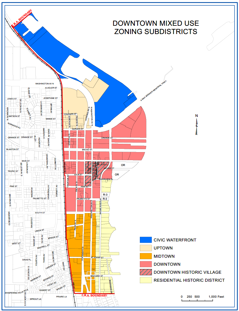 Downtown Mixed-Use Zoning District (DMU) Boundaries. The boundaries of the Downtown Mixed-Use (DMU) zoning district are the same as the boundaries of the Downtown Community Redevelopment Area, with the exception of the Residential Historic Preservation Zoning District. The Residential Historic Preservation District shall retain the same zoning designation; however, all properties in this district with the DCRA shall comply with the Administrative procedures of Chapter 28, Article III, Division 1. The Downtown Community Redevelopment Area as created by City Council under Ordinance 66-1982 pursuant to the powers conferred by Section 163.330, Florida Statutes, entitled "The Community Redevelopment Act of 1986" and any amendments thereto, specifically those powers granted in Section 163.330 et seq. [Florida Statutes], and as refined within this subsection. The boundaries of the Community Redevelopment area are as follows: