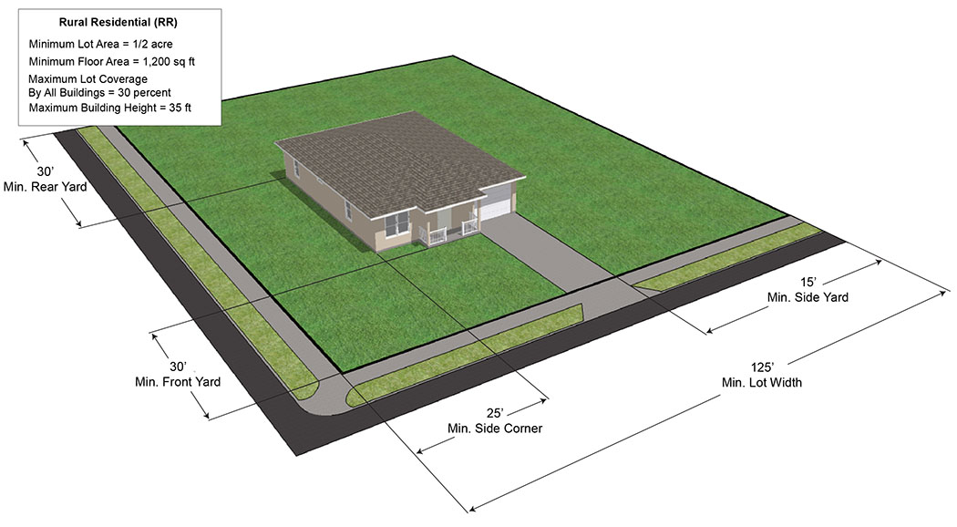 | The Rural Residential district (RR) is intended to provide for low-density large lot development of one-half (0.5) acre or larger in size. Certain structures and uses that will serve governmental, religious, recreational, and other immediate needs of such areas are permissible as permitted or conditional uses subject to all restrictions necessary to preserve and protect the low density character of this district. | ||