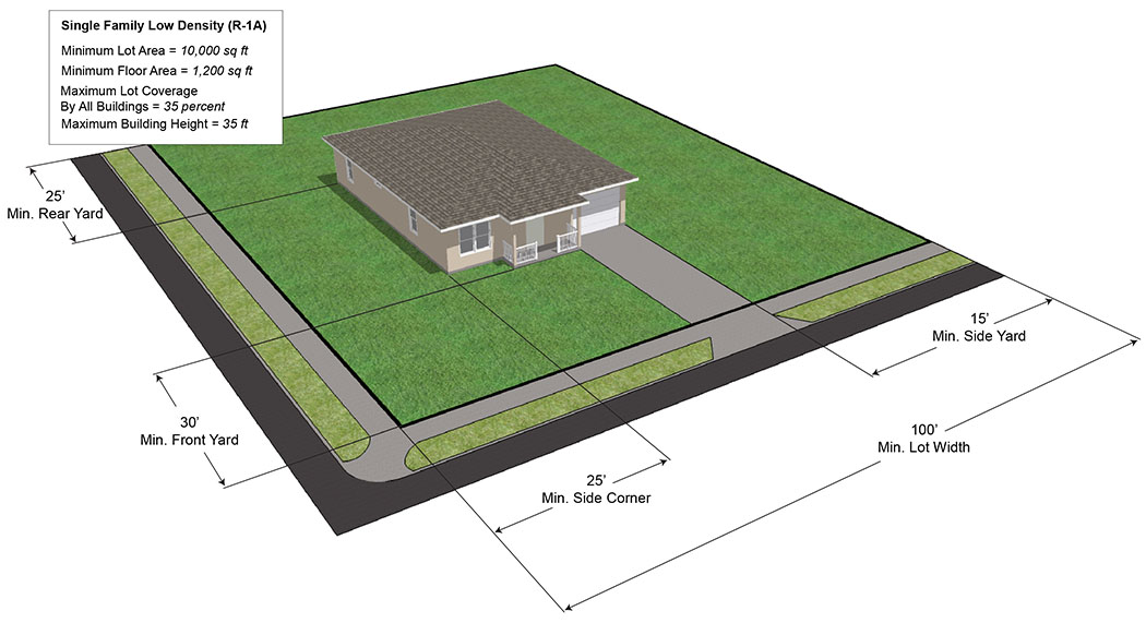 | The Single-Family Low Density (R-1A) district is established as a designation for the principal use of low-density single-family dwellings of spacious character together with certain structures and uses that are compatible with property in the district. It is further intended that governmental religious, recreational and other immediate needs of this district are served while the existing development of this character is protected. | ||