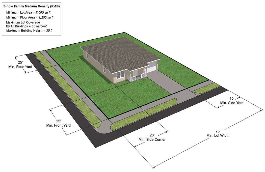 | The Single-Family Medium Density (R-1B) district is designed as a district for the principal use of medium-density single-family dwellings. The purpose of the district is to promote orderly and proper development of single-family residential units together with certain structures and uses that are compatible with property in the district. It is further intended that governmental, religious, recreation and other immediate needs of this district are served while a quality environment is provided for the residents of this designation and City. | ||