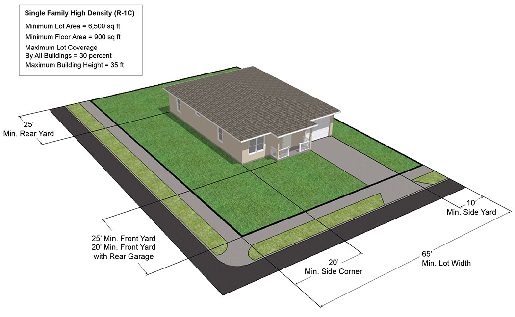 | The Single-Family High Density (R-1C) district is established as a designation for the principal use of high-density single-family dwellings. The purpose of this district is to promote stable quality residential development at slightly increased densities together with certain structures and uses that are compatible with property in the district. It is further intended that governmental, religious, recreational and other immediate needs of this district are served while a quality environment is provided for the residents of the designation and City. This district provides the transition between single-family densities and higher density development. | ||