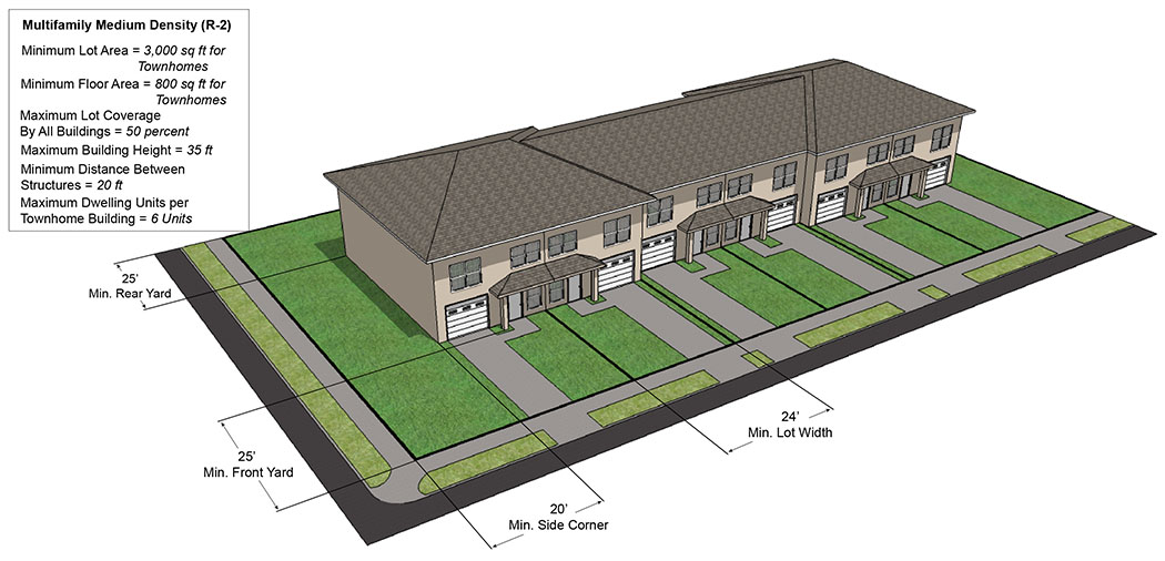 | The Multifamily Medium Density Residential (R-2) district is intended to allow the erection of a variety of housing types at a maximum density of nine (9) units per acre. This district is designed to allow development adjacent to arterial or collector streets and is well served by public services and facilities. When adjacent to R-1 zoning districts, the development within this district shall be designed carefully to provide maximum compatibility with adjacent development by proper architectural design, landscaping, screening and parking. | ||
