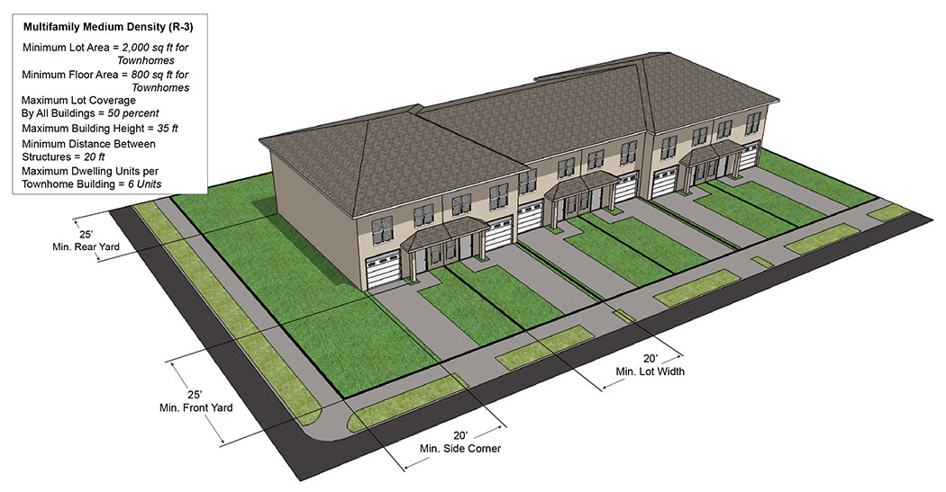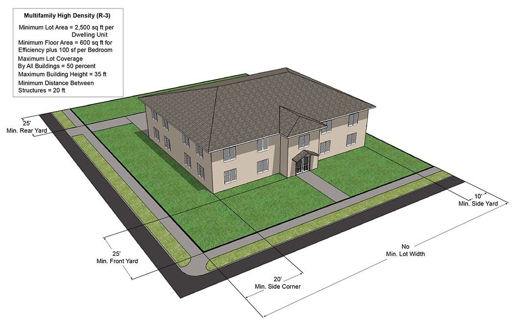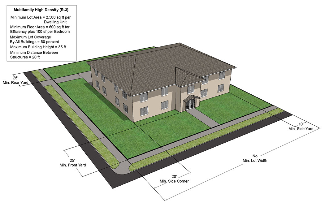 | The Multifamily High Density Residential (R-3) district is intended to allow the development of a variety of housing types at a maximum density of fifteen (15) units per acre. This district is further intended to satisfy the need for a high concentration of population, is located adjacent to arterial or collector streets and is well served by public services and facilities. When adjacent to R-1 zoning districts, the development within the district shall be designed carefully to provide maximum compatibility with adjacent development by proper architectural design, landscaping, screening, and parking. | ||