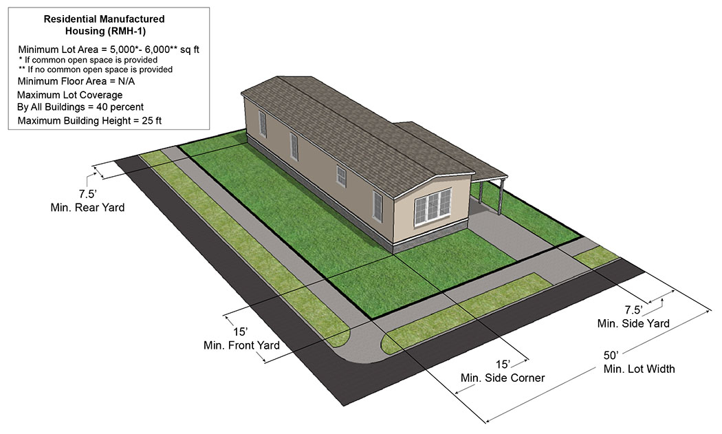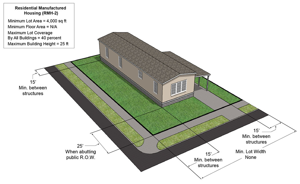 | The Residential Manufactured Housing (RMH-1) district is established to allow for the suitable development of mobile homes and manufactured housing subdivisions platted in accordance with the subdivision regulations of the Land Development Regulations. Manufactured housing subdivisions shall be developed at a maximum density of six (6) units per acre and shall be located, designed and improved to provide a desirable residential living environment, protection from potentially adverse neighboring influences, protection for adjacent residential properties and access for vehicular traffic without traversing minor streets in adjoining residential neighborhoods. It is the further intent to declare that the mixing of manufacturing housing and conventional dwellings in the same development may potentially produce mutual incompatibility for both types of dwellings. To that end, manufactured housing shall be developed in residential manufactured housing subdivisions. | ||
