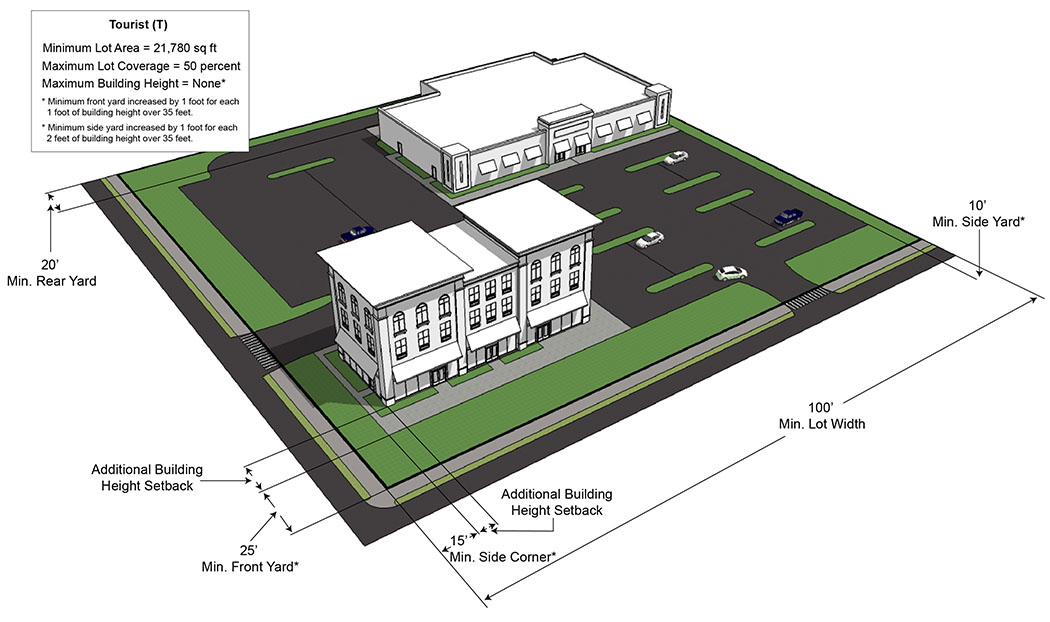 1 Transient accommodations, boarding houses and other tourist accommodations not noted as a permitted use of this zoning district shall have a maximum density of fifteen (15) units per acre. If fifty (50) percent or more of the units do not have cooking facilities, thirty (30) units per acre may be allowed subject to conditional use permit approval. Density may be increased to 20 units per acre per the regulations in Sec. 28-71(c). 2 May be increased up to 15 units per acre per the regulations in Sec. 28-71(c). 3 If all required parking is covered by a permanent structure, the lot coverage may be increased to 50 percent. 4 An additional one (1) foot side yard setback shall be required for each foot of building height above 35 feet. 5 For properties with structures located adjacent to a local street or Riveredge Drive, the maximum building height along the street shall not exceed 35 feet at the setback lines. One and one-half feet of additional setback shall be required for each foot of building height over 35 feet. | |