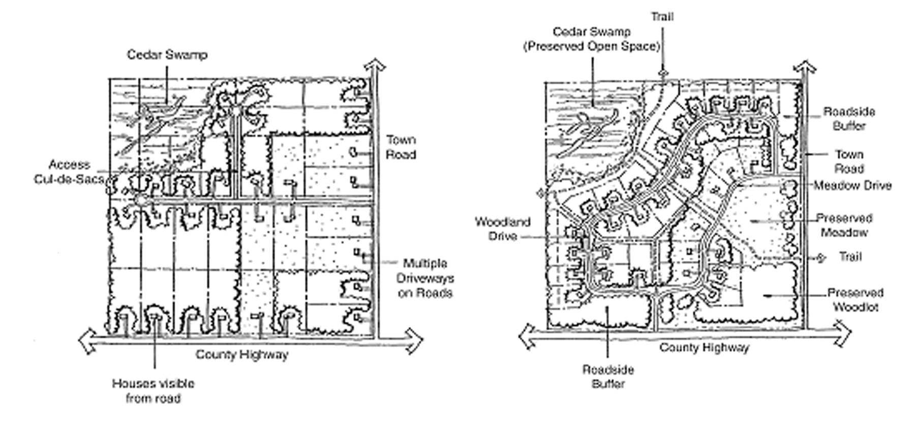 Surface parking lots and garages shall be located and/or buffered with landscaping, varied setbacks or recessed garage doors, or some combination so that they are not the dominant visual elements from public roads.