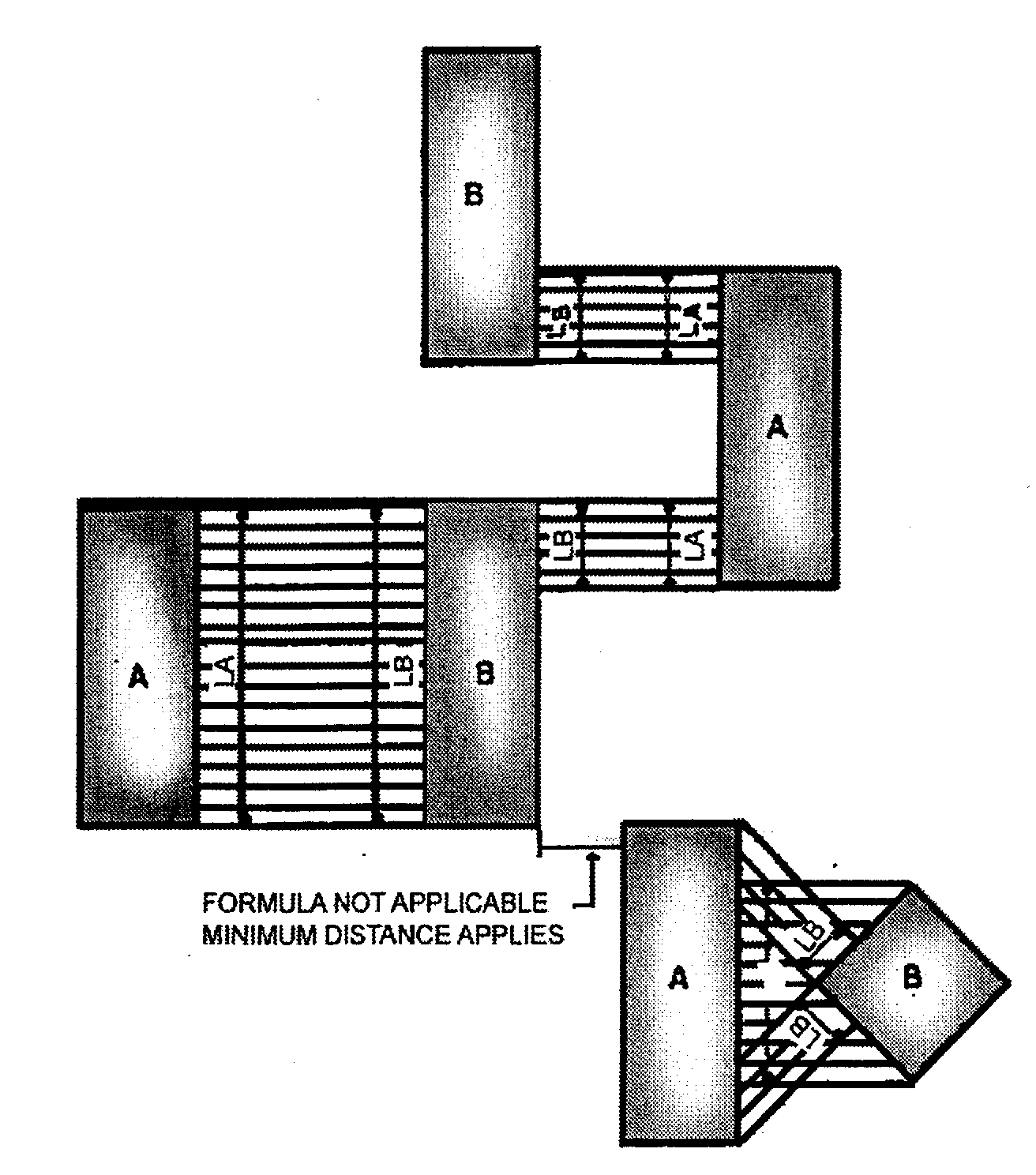 = ;hg;Required minimum horizontal distance between any wall of building A and any wall of building B or the vertical prolongation of either.