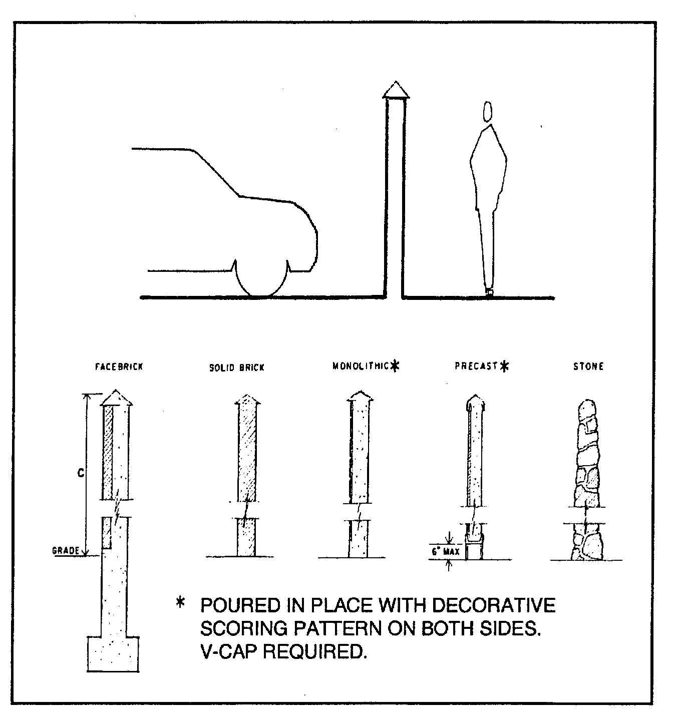 All masonry screen wall structures permitted in this section, including concrete panel walls and brick etched concrete walls, shall include a cap. The cap shall be a vee-type of cap that shall consistently extend along the entire top of the wall. The angle of the vee shall not be less than 45 degrees so that it will quickly shed water and discourage walking on top of the cap. The vee cap shall extend out beyond the vertical sides of the wall.