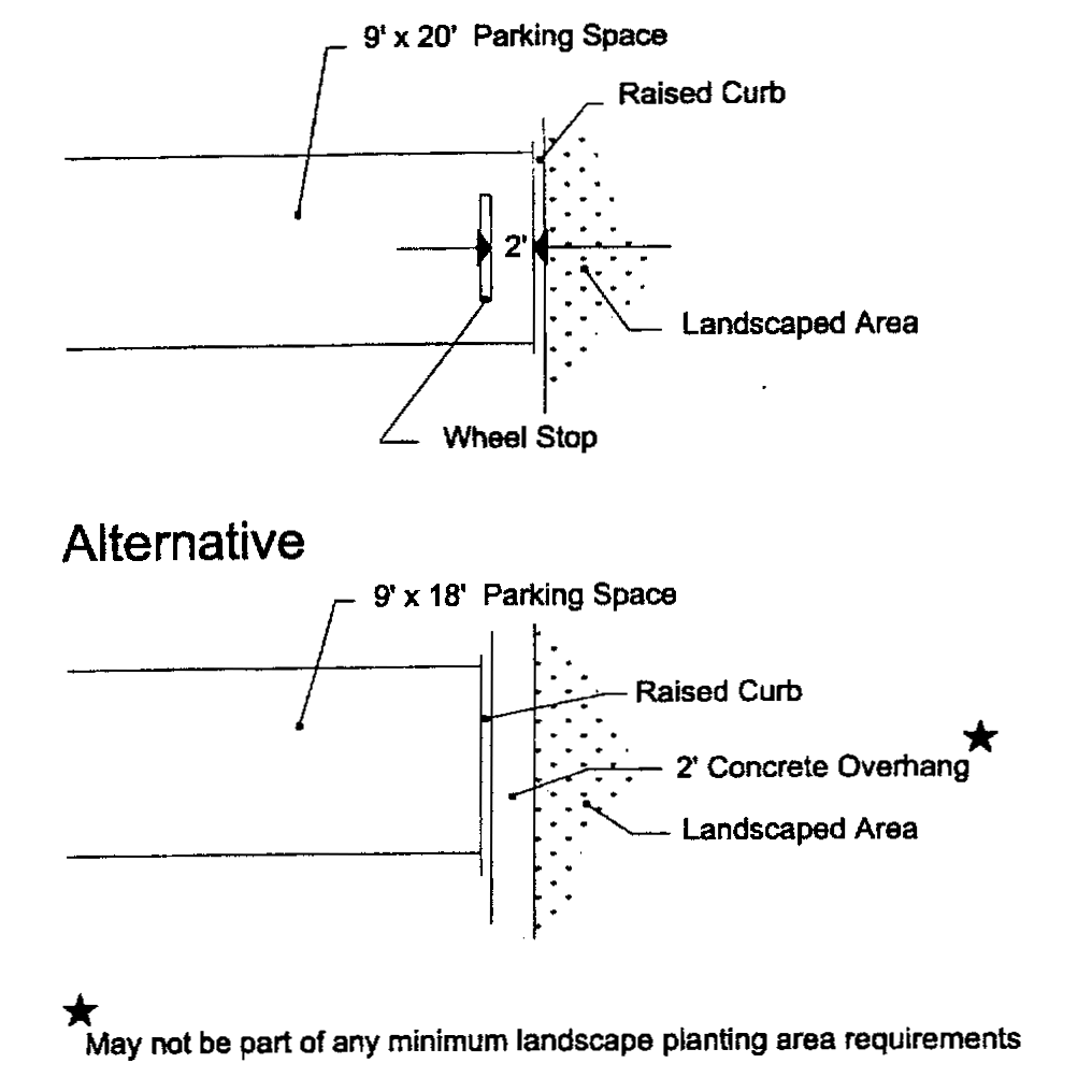 In place of a concrete wheel stop the minimum required length of an off-street parking space, with city staff approval, may be reduced by two feet in length, provided two feet of concrete shall abut the rear of the raised curb line at the front of the parking space for the full width of the parking space; Except the two feet of concrete shall be in addition to, and shall not be any part or portion of any minimum landscape planting area requirements of this section.