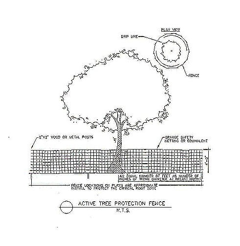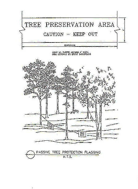 Passive Tree Protection shall consist of heavy (as determined by arborist) mill plastic flagging of a bright color or equivalent signage on a continuous, durable restraint sufficient to delineate the bounds of any tree protection or save areas. See appendix E.