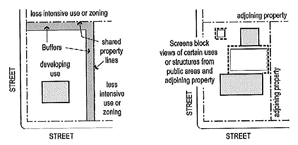 Criteria for buffers and screening shall be determined during the review of site development plans where not otherwise specified. At a minimum, buffers and screening shall meet the following criteria: